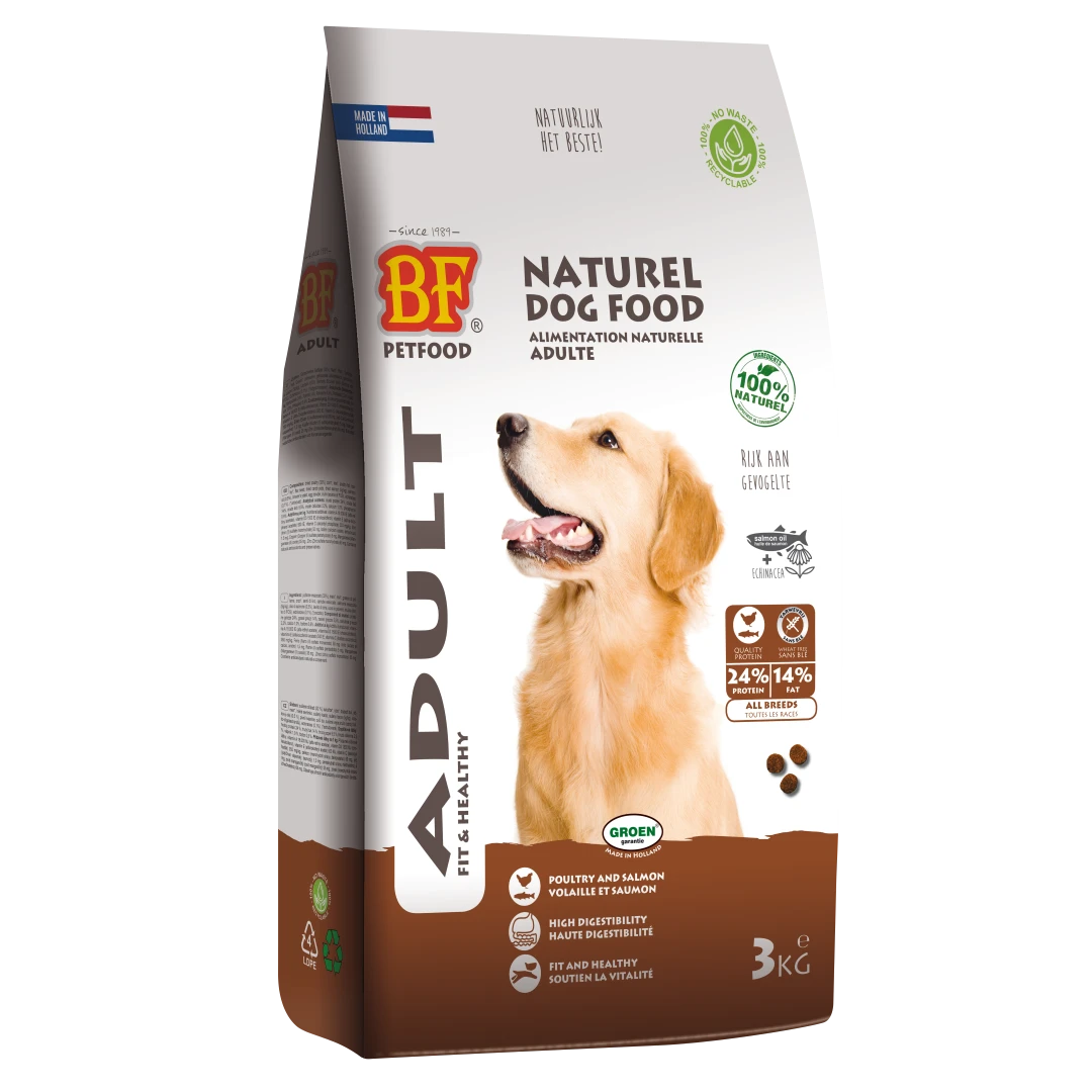 BF Petfood® Adult Krokant. Nederlandse topkwaliteit. Hoogwaardige premium grondstoffen. Volledige licht verteerbare geëxtrudeerde hondenvoeding voor volwassen honden. Met gevogelte en zalm. Tarwevrij. Hoge acceptatie en verteerbaarheid. Optimale voeding die zorgt voor een betere vertering, ontlasting en een goede conditie van uw hond. Zonder chemische toevoegingen. Voor volwassen honden.