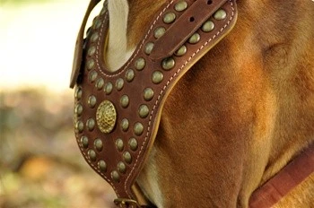 Een stoer en zeer hoogwaardig hondentuig voor de grotere hondenrassen. De grote borstplaat versierd met messing studs en een grote gehamerde munt. Dit hondenharnas is geschikt voor een echte krijgshond ! De borstplaat is gemaakt van dik leer. De hardware wordt speciaal in Zwitserland gemaakt en het leer komt uit de beste leerlooierijen in het Verenigd Koninkrijk.