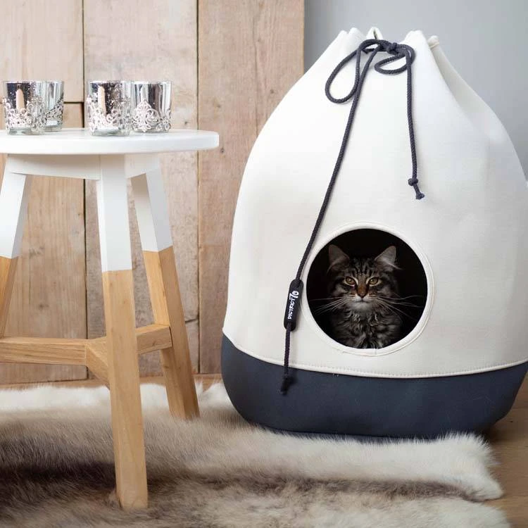 Dit is een opvallende en trendy kattenmand. De mand is gemaakt van sterk en stevig canvas. Aan de bovenkant bevindt zich een opening, die met het koord gesloten kan worden. De kat heeft vaak behoefte aan een overdekte schuil- en slaapplaats en zal zich in deze bijzondere kattenmand zeker op z’n gemak voelen.