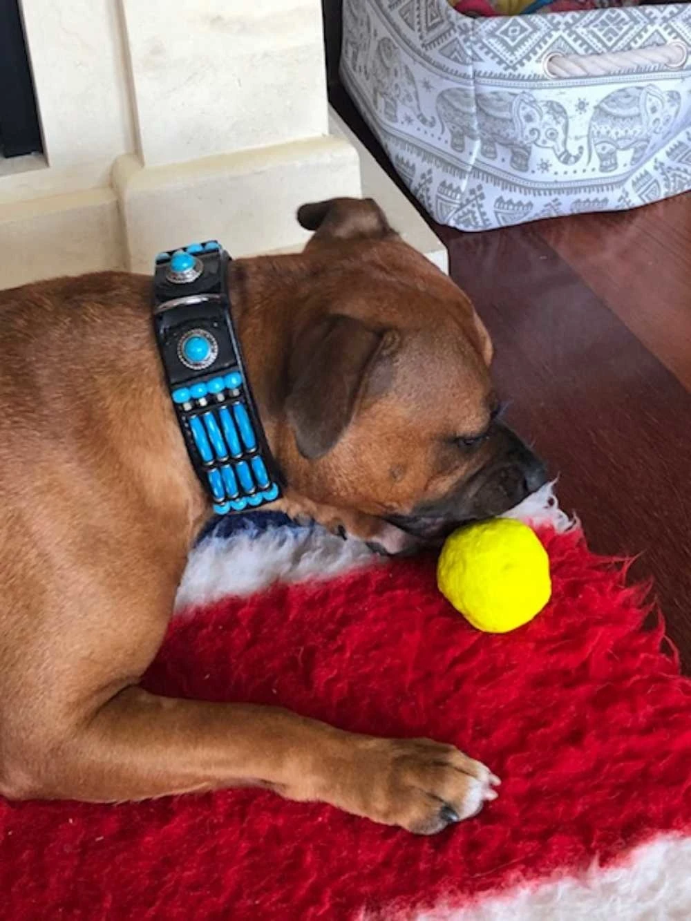 Deze opvallende en mooie halsband is gemaakt van stevig dubbellaags zwart leer. De hondenhalsband is heel opvallend door de prachtige blauwe elementen die extra opvallen op het zwarte leer. De halsband is gevoerd met zacht kalfsleer voor extra comfort voor uw hond. Dit is een grote maat dus perfect geschikt voor de grote hondenrassen !