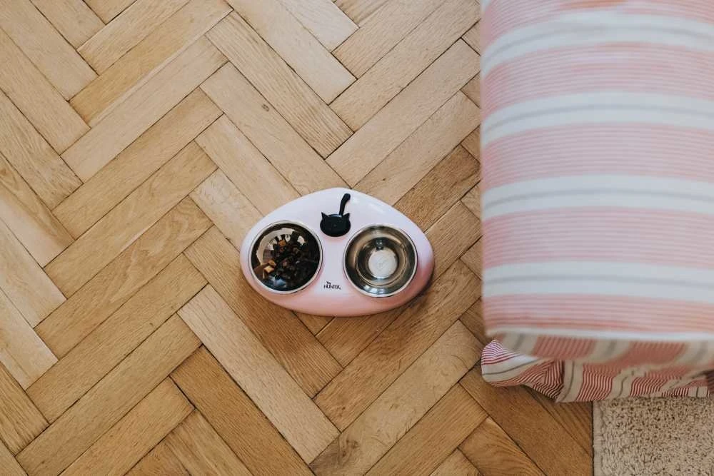 De bak is gemaakt van melamine. Dit is een harde en sterke kunststof die bestand is tegen zuren en etensresten. Bovendien is het materiaal duurzaam, krast niet en verkleurt niet in het zonlicht. Verder heeft deze bak twee uitneembare RVS bakjes. De voerbak en de RVS bakjes kunnen in de vaatwasser worden gereinigd. De bak heeft een indicator waarmee aangegeven kan worden wanneer de kat voor het laatst voedsel heeft gekregen. De indicator is gemaakt in de vorm van een kat met een lange staart.