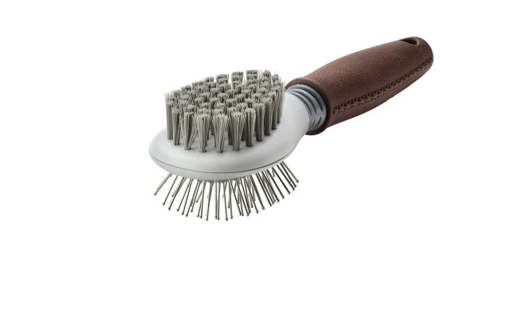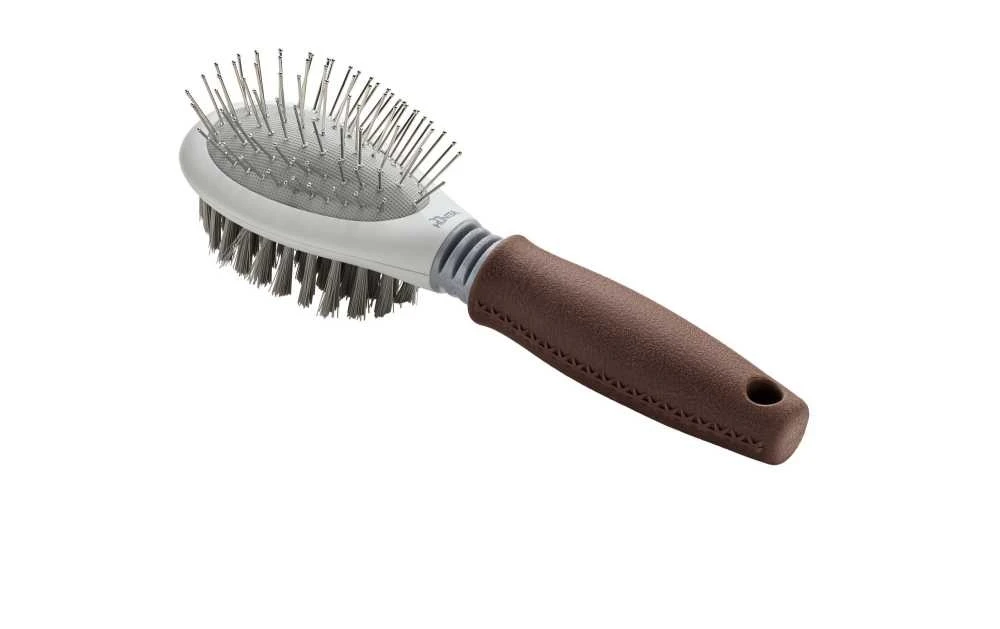 Deze allround hondenborstel is geschikt voor elk type vacht. De borstel heeft aan de ene kant zachte haren en vernikkelde pinnen aan de andere kant. De zachte borstelharen zorgen ervoor dat de oliën gelijkmatiger door de vacht worden verdeeld, terwijl de pinnen helpen om de top- en ondervacht voorzichtig te verzorgen. De flexibele hals van de borstel voorkomt dat u te veel druk uitoefent – een echt voordeel voor het welzijn van uw hond. De borstel past zich optimaal aan de structuur van de vacht en de contouren van uw hond aan. De ergonomisch gevormde handgreep is antislip en gemakkelijk in gebruik.