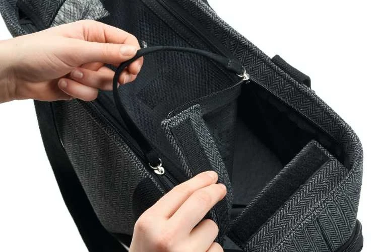 De binnenkant van de tas bevat andere handige functies die de tas nog nuttiger en praktischer maken. Aan de binnenkant van de tas is bijvoorbeeld een nylon riempje met karabijnhaak bevestigd, zodat u uw hond in de tas kunt vastmaken. De hond kan dus niet eruit springen of door iemand worden verwijderd