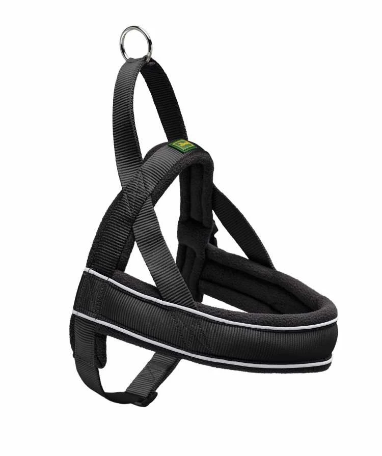 Het harnas heeft een traploos verstelbare buikriem zodat het harnas een goede pasvorm heeft voor de hond. De zachte voering van fleece rond de borst, de nek en de schouders van de hond is erg comfortabel voor de hond. De banden van duurzaam nylon en de fleecevoering maken het harnas ook zacht voor de vacht. Voor extra veiligheid heeft het harnas reflecterende strips op de banden, die de zichtbaarheid van uzelf en van uw hond in omstandigheden met weinig licht vergroten.