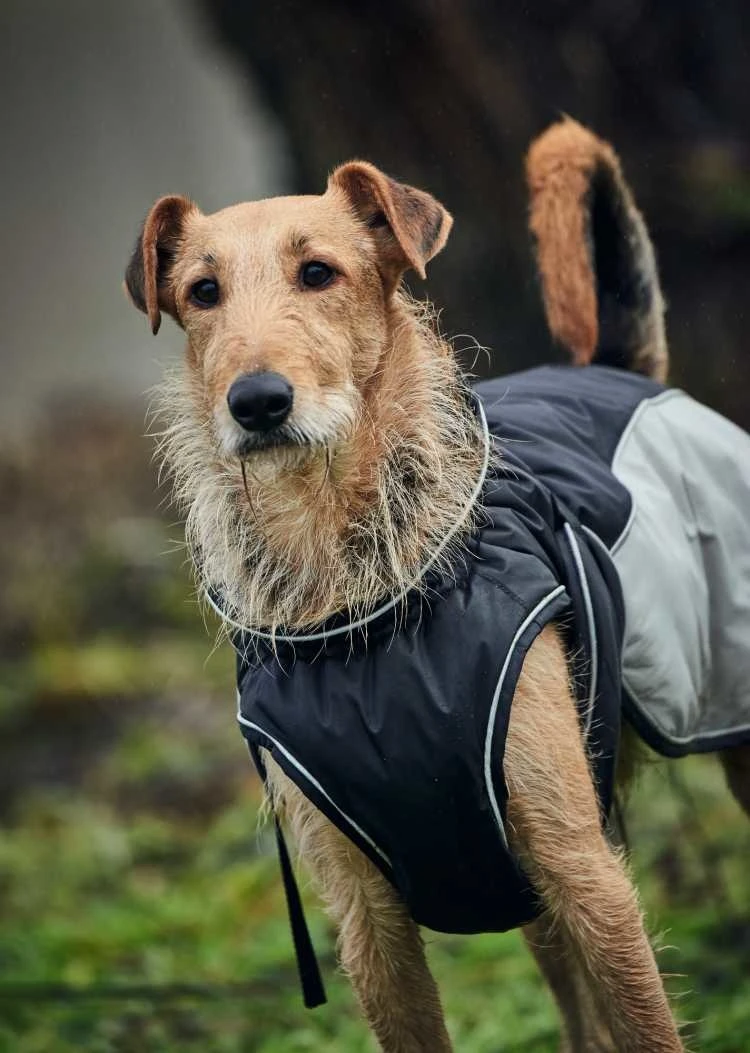 Deze fantastische zwarte / grijze hondenjas is van topkwaliteit. De polyester hondenjas is waterafstotend. De jas is gevoerd met super warme 3M Thinsulate isolatie dat de hond aangenaam warm houdt en optimaal beschermd wordt tegen kou. Bovendien is dit model water- en vuilafstotend en antibacterieel met SILVERPLUS® en BIONIC FINISH® C6. De elastische bevestigingsbanden voor de achterpoten (variabel in positie en lengte) zorgen voor een perfecte pasvorm, ongeacht de lichaamsbouw van uw hond. De nek van de hondenjas is in de breedte verstelbaar door middel van een elastische band en heeft een opening voor de D-ring van een halsband. Op de rug is er een ritssluiting zodat de hond ook een tuigje kan dragen.