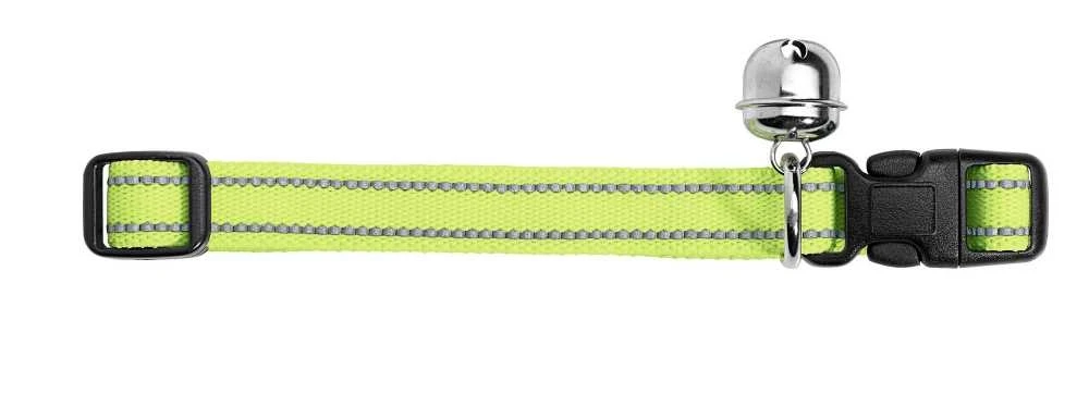 Dit is een gele kattenhalsband die is gemaakt van elastisch nylon. De halsband heeft reflecterende strepen. De halsband is voorzien van een klassieke kliksluiting. Verder is de halsband is traploos verstelbaar en heeft een belletje.