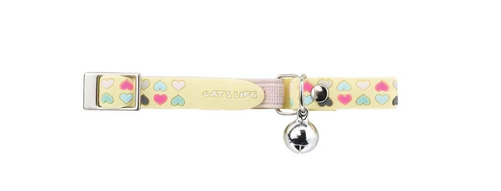 Dit is een leuke gele kattenhalsband die is gemaakt van stevig en onderhoudsarm rubber. De halsband heeft een lief patroon van hartjes. De halsband is voorzien van flexibel rubberen inzetstuk. Verder is de halsband is traploos verstelbaar en heeft een belletje.