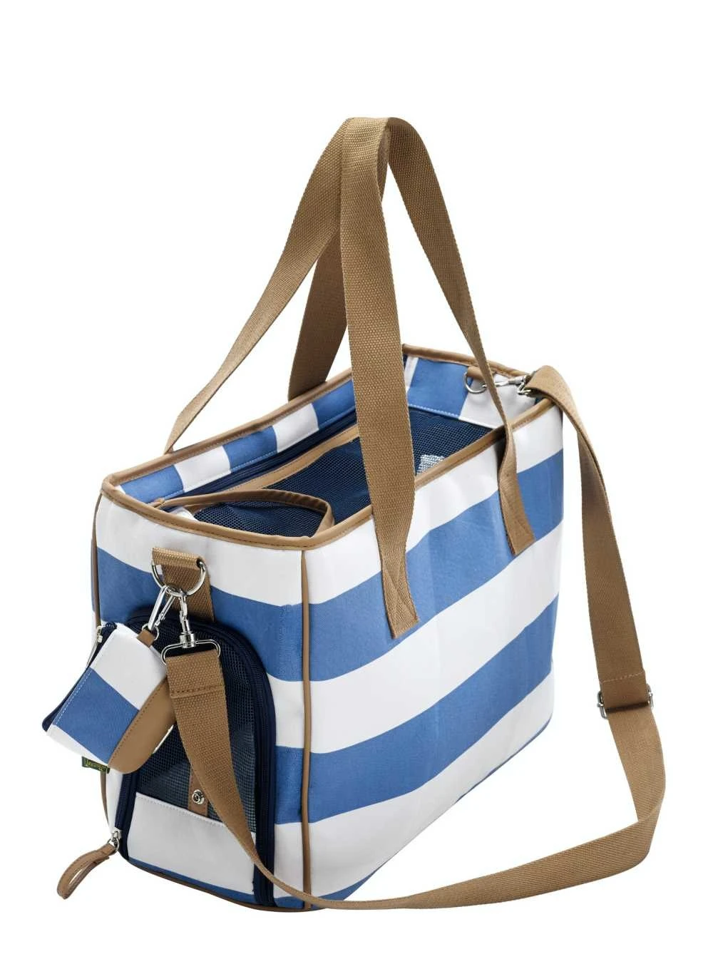 Een fraaie blauwe kattentas die te gebruiken is als draagtas of schoudertas. De vrolijke uitvoering in blauw met witte strepen geven de tas een maritiem uiterlijk. Het raam en deur zijn voorzien van gaas. Er is een ingang aan de voorkant van de tas. De tas wordt compleet geleverd met een bijpassende poepzakhouder. In de tas is er een riempje met een kleine karabijnhaak waaraan u de riem van de kat kunt vastmaken.