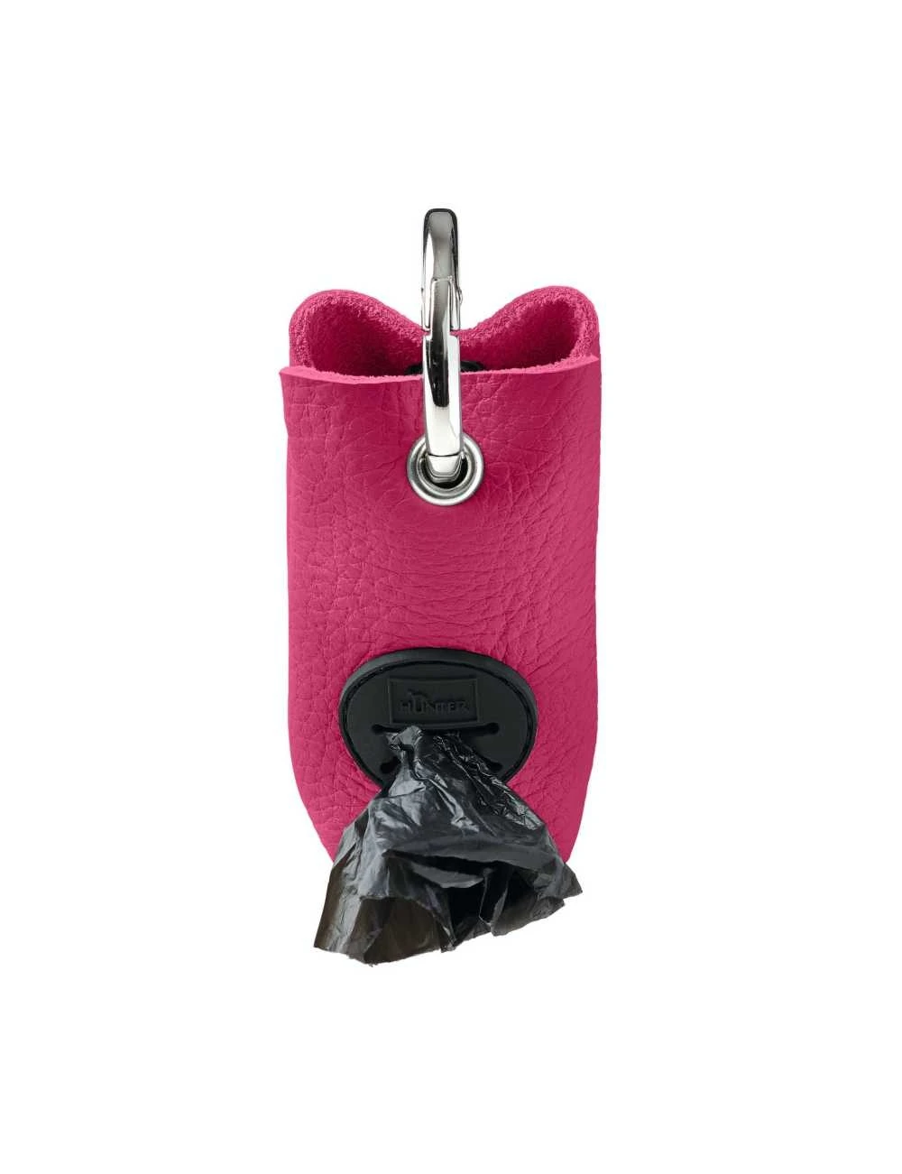 De poepzakhouder is gemaakt van roze leer en wordt geleverd inclusief een rol poepzakjes.