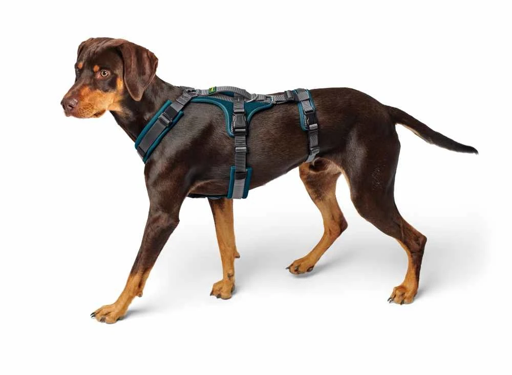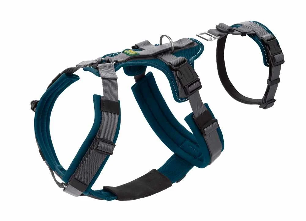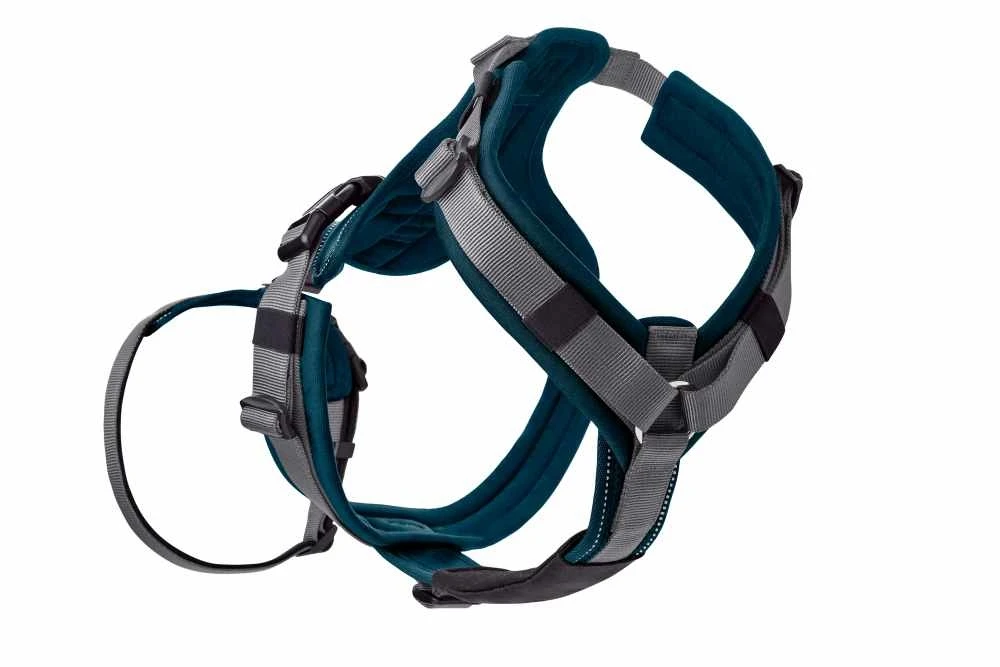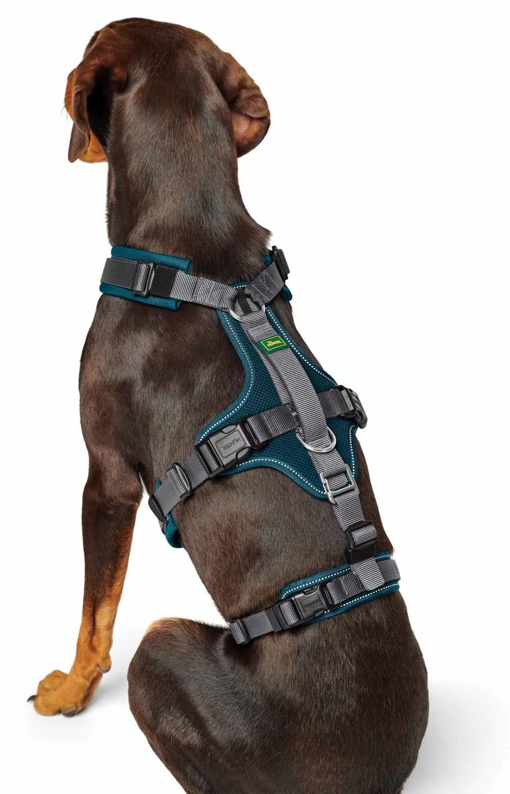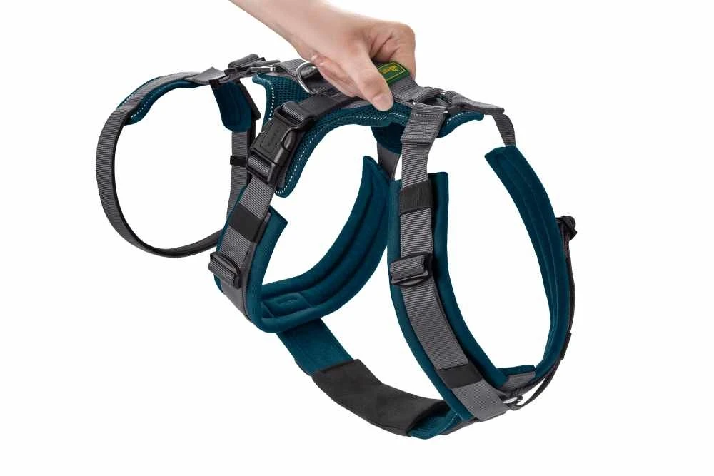 Het veiligheidsharnas heeft als extra’s allereerst een handvat aan de achterzijde (vanaf maat S-M) waarmee de hond in een gevaarlijke situatie snel en veilig kan worden vastgehouden. Daarnaast is het voorzien van de extra buikband. Deze kan individueel worden aangepast voorkomt dat de hond “naar achteren ontsnapt” en uit het tuig “loskomt”.
