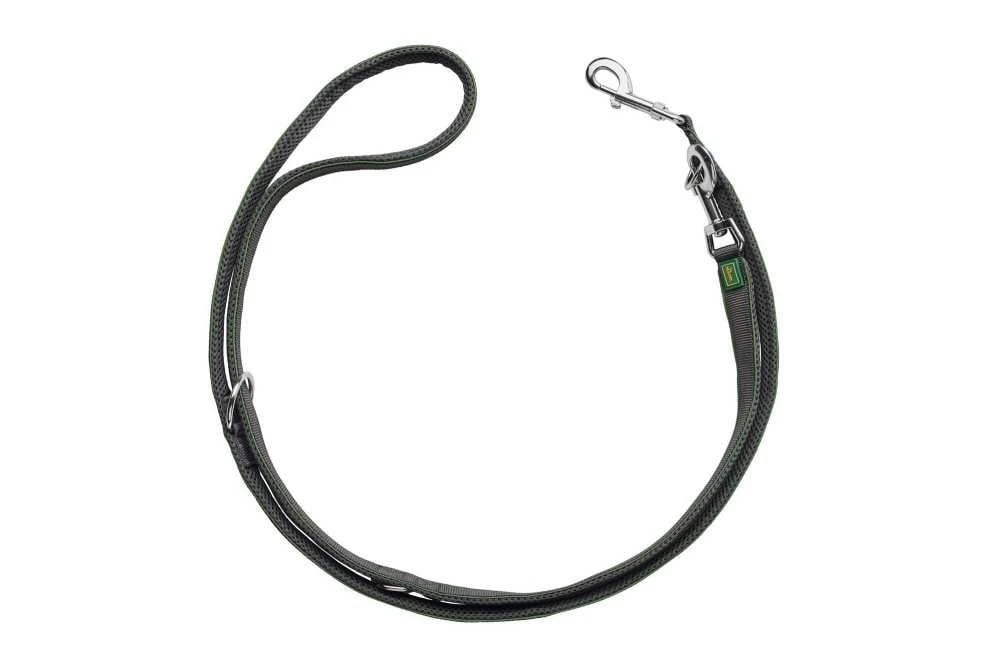 Een praktische grijze hondenriem, die is gemaakt van robuust nylon. De riem is gevoerd met zacht mesh materiaal, zodat deze bijzonder comfortabel is voor uw handen. De riem heeft een handvat en is drievoudig verstelbaar. Door de groene biezen past deze lijn perfect bij de halsbanden en tuigen uit de Divo serie.