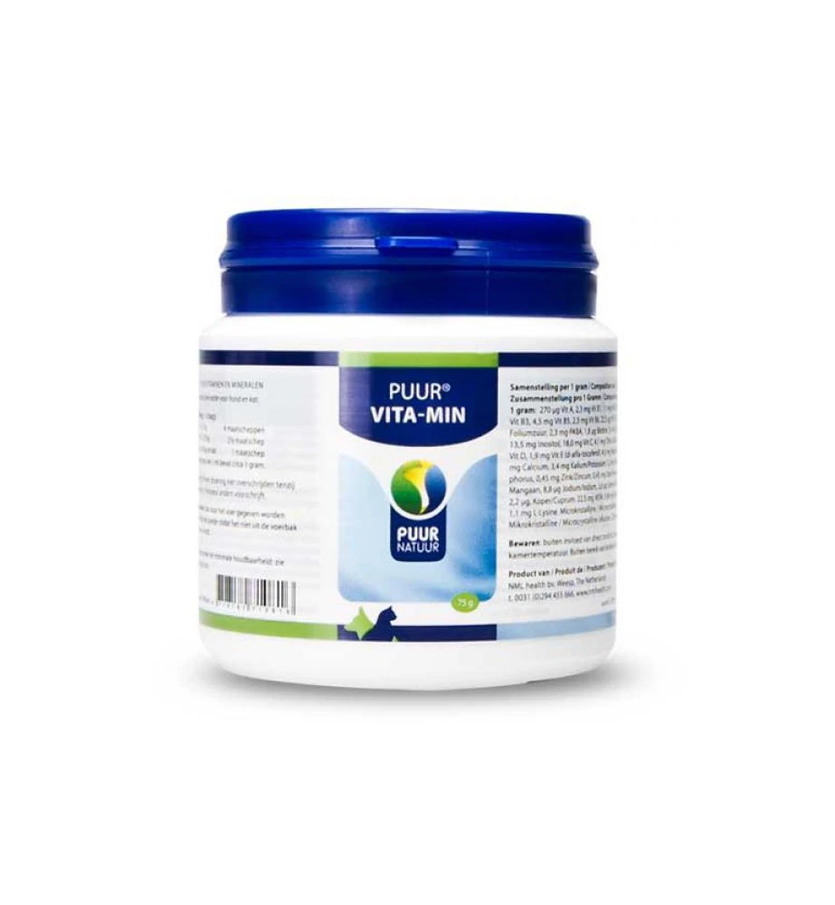 PUUR Vita-Min / Vitaminen en Mineralen is een voedingssupplement voor honden en katten ter bevordering van het immuunsysteem en herstel, tijdens of na ziekte.