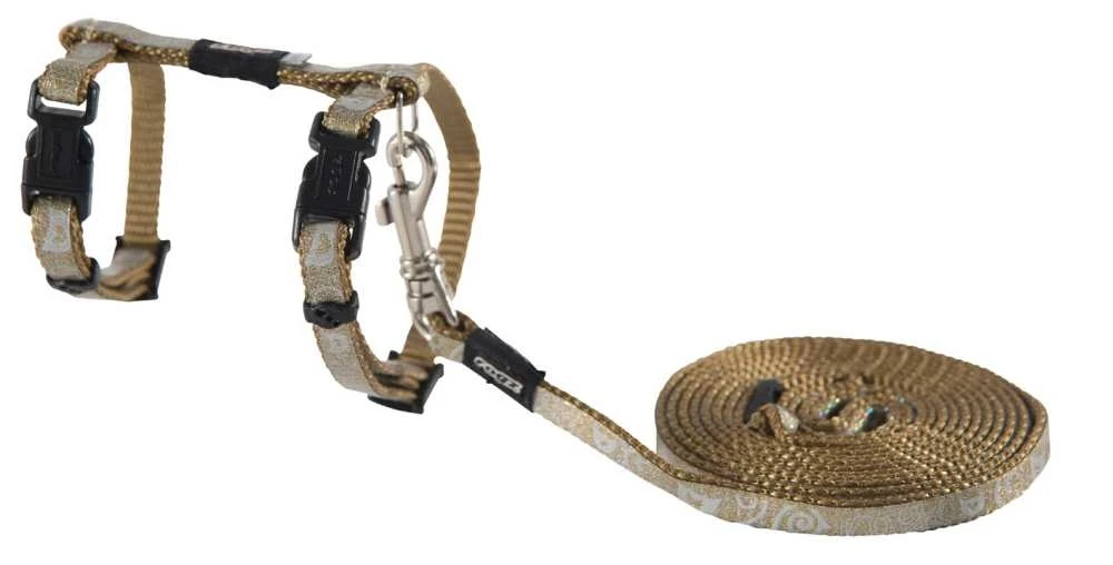 Dit is een goudkleurig kattentuigje van 100% polyester en biedt u een print met glitter en glamour. De reflecterende tape zorgt voor extra zichtbaarheid bij slecht licht. Het tuigje is voorzien van twee veiligheidssluitingen: Rogz ontwikkelde de ‘break away safety buckle’. Dit zorgt ervoor dat de sluiting openspringt als de kat ergens aan blijft haken. Het mooie en unieke aan deze sluiting is dat u zelf de belastbaarheid kunt instellen, om te voorkomen dat het kattentuig te snel openspringt. Wel zal het tuigje altijd open blijven springen als er teveel druk op de sluiting wordt uitgeoefend.