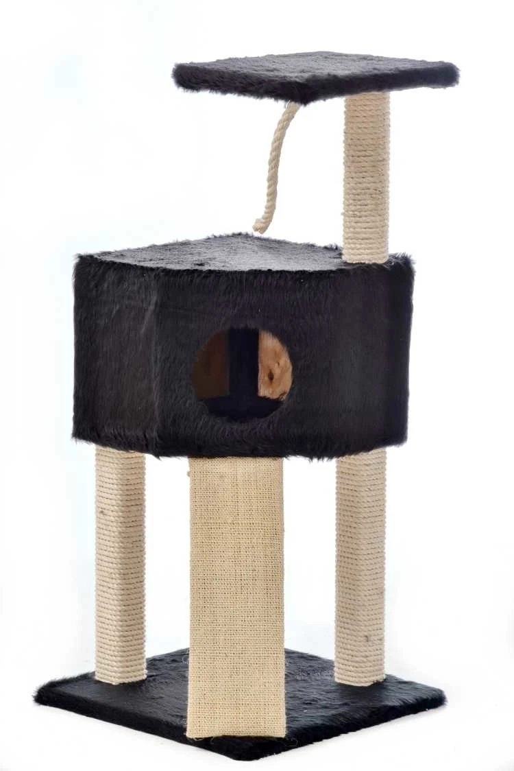 Een fraaie krabpaal voor de kat die u heel praktisch in een hoek van de kamer kunt plaatsen, dat veel plaats bespaart.. Katten vinden het heerlijk om te klimmen en om de omgeving te bekijken. Deze krabpaal heeft twee massief houten palen met sisaltouw. De krabpaal biedt verder een hoog gelegen plateau. Er is ook een overdekte rust- of slaapplaats. Voor veel speelplezier hangt er een sisal touw in het midden van de krabpaal. Alle rustplaatsen zijn bedekt met zwart pluche.