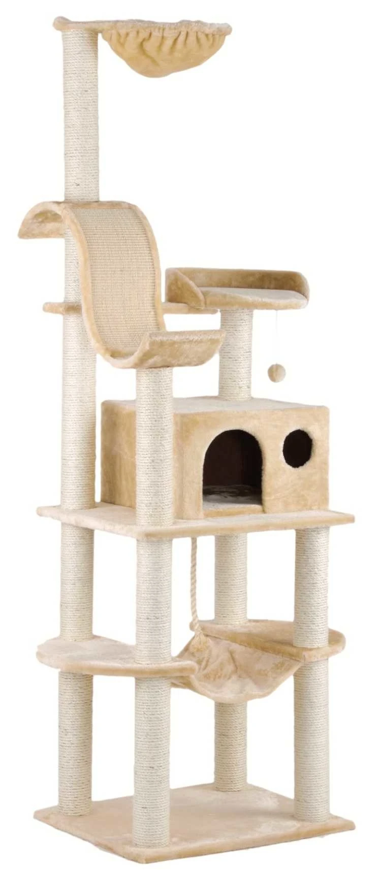 Een beige krabpaal met vele mogelijkheden voor de kat. Zo kan de kat naar hartelust de nagels krabben want de krabpaal heeft vier palen met sisaltouw. Verder zijn er verschillende ligplaatsen op diverse niveau’s en een hangmandje. Onderaan de krabpaal bevindt zich een leuke hangmand. Ook is er een overdekte rustplaats. Voor extra veel krabplezier is er een hooggelegen krabboord.