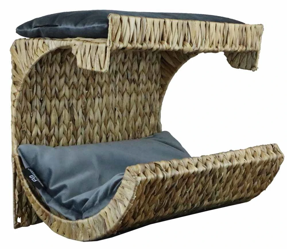 Deze kattenmand voor bevestiging aan de muur heeft een stabiele metalen basis. De mand wordt met de hand gemaakt van gevlochten waterhyacint. Hierdoor is deze kattenmand bijzonder decoratief en stijlvol. De mand biedt uw kat twee ligplaatsen met grijze fluwelen kussentjes met een fleece vulling.