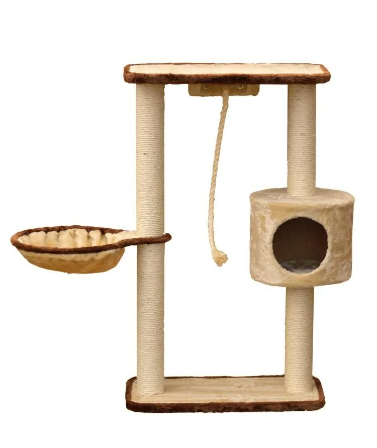 Een fraaie klimpaal voor uw kat of kattenfamilie, die bevestigd wordt aan de muur. Dit levert u veel ruimtebesparing op. De krabpaal heeft twee palen met sisaltouw, een hangmandje, twee platforms en een overdekte rustplaats. De kat zal het speeltouw ook erg interessant vinden om mee te spelen.